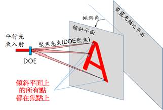 一般演算法做近場設計,可以讓投射影像聚焦,但其聚焦面需平行於 DOE 平面。