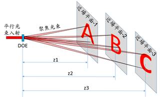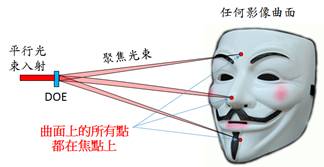 本公司的演算法則可在一片 DOE 中同時投射出多個具有不同深度的平面圖案,而且平面不限制需平行於DOE面,每一個平面都可具有任意角度。
